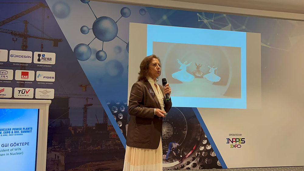 Fuara paralel olarak gerçekleşen Nükleer Güç Santralları Zirvesine davetli konuşmacı olarak katılan Başkanımız B. Gül Göktepe “Çevre Güvenliği ve Nükleer Güç Üretimi” konulu sunum yaptı. Büyük ilgi gören konuşmasında Göktepe iklim değişikliğinin tüm dünyada etkisini kabus olarak anlattıktan sonra nükleer çevre güvenliği yönünden nükleerin kritik özelliklerini ardından reaktörlerin çevre etkileşimini yedi kriter le anlattı. Nükleer enerjinin iklim değişikliği ile mücaadelede çözümün en önemli kısımlarından olduğunu açıkladı. NGS lerin mühendislk güvenlik sistemlerini ve risk endişesine karşı 3S sistemlerinin önemine değindi. Nükleer gücün zamana bağlı olarak evrimini anlatarak sunumunu dönen atomları sufi dönüşüyle sembolize dönen atomlar ve dönen dervişler le sembolize ettiği ettiği mükemmeliyetçilik felsefesi anlatımıyla bitirdi.